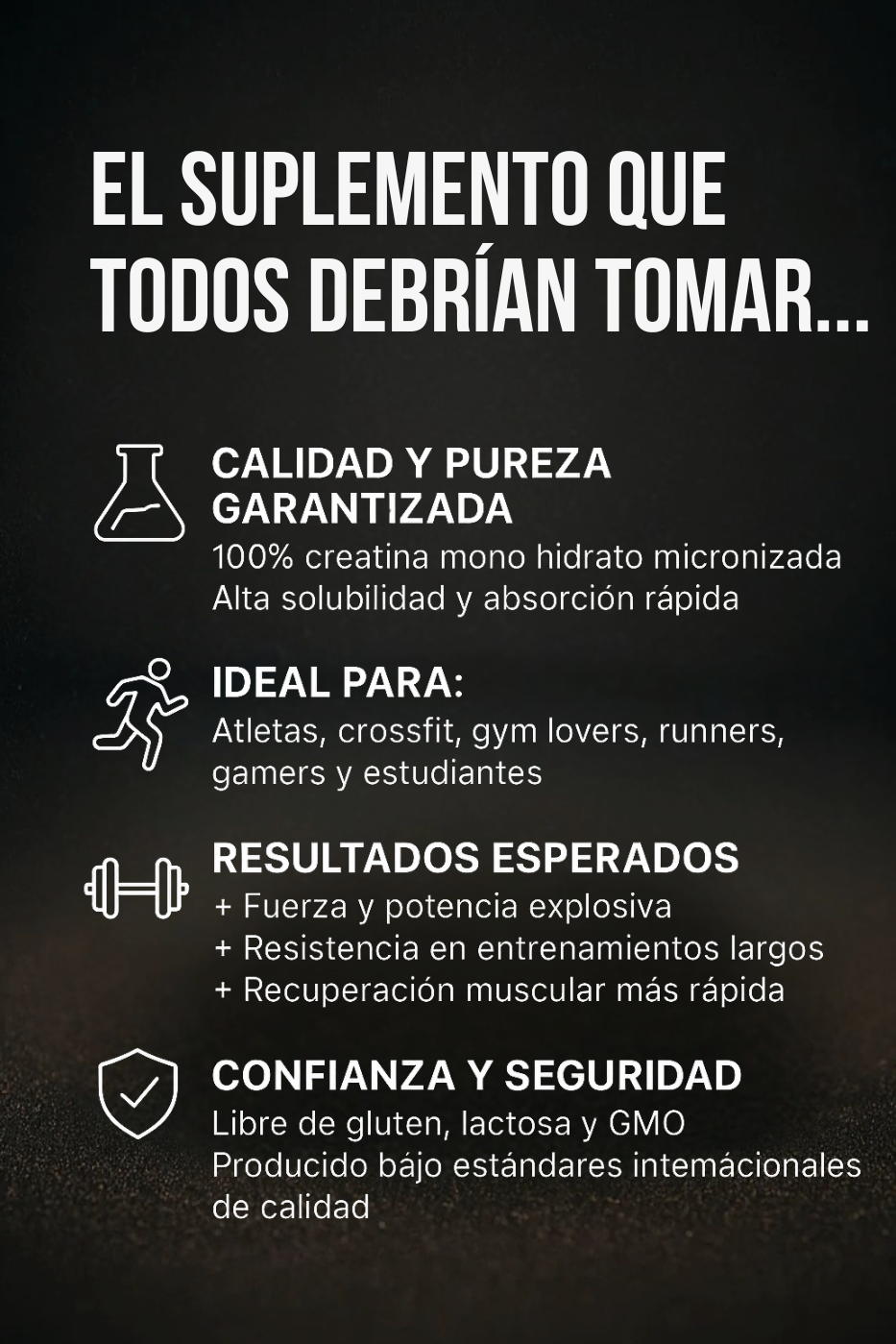 1. Explosión de Fuerza: Incrementa significativamente las reservas de fosfocreatina muscular, proporcionando la energía instantánea que necesitas para ejercicios explosivos y levantamientos de alta intensidad, maximizando tu potencia en cada repetición.